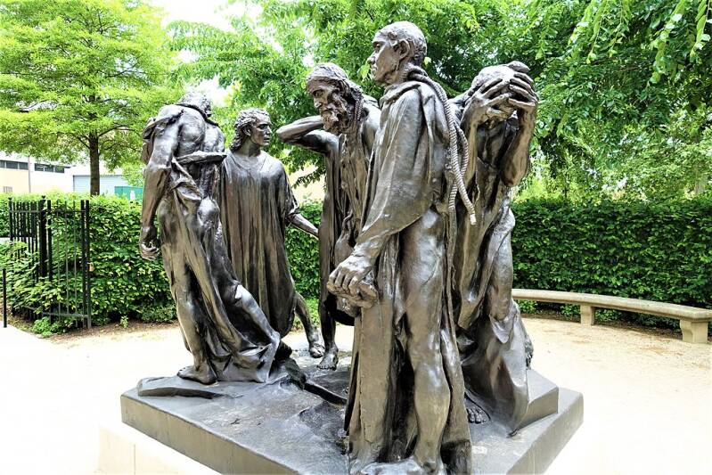 Het kunstwerk De Burgers van Calais beeldt een fase uit de Honderdjarige Oorlog uit. Calais werd in 1347 door het al elf maanden durende beleg gedwongen tot overgave wegens de grote hongersnood in de stad. Zes vooraanstaande burgers hadden het plan opgevat hun leven te schenken aan de Engelse koning in ruil voor het sparen van de stad. Met niets anders gekleed dan een hemd en met de strop reeds rond hun nek trokken ze naar Eduard III om hem de sleutel van de stad te bezorgen. Ontroerd door de zelfopoffering van de mannen wierp Eduards vrouw Filippa van Henegouwen zich aan de voeten van haar man en smeekte hem hun leven te sparen, wat dan ook gebeurde. In tegenstelling tot de huidige presentatie, was het oorspronkelijk Rodins bedoeling zijn schepping te plaatsen op een voetplaat van slechts 25 cm hoogte, zodat de burgers als het ware tussen de voetgangers op de markt zouden lopen.
