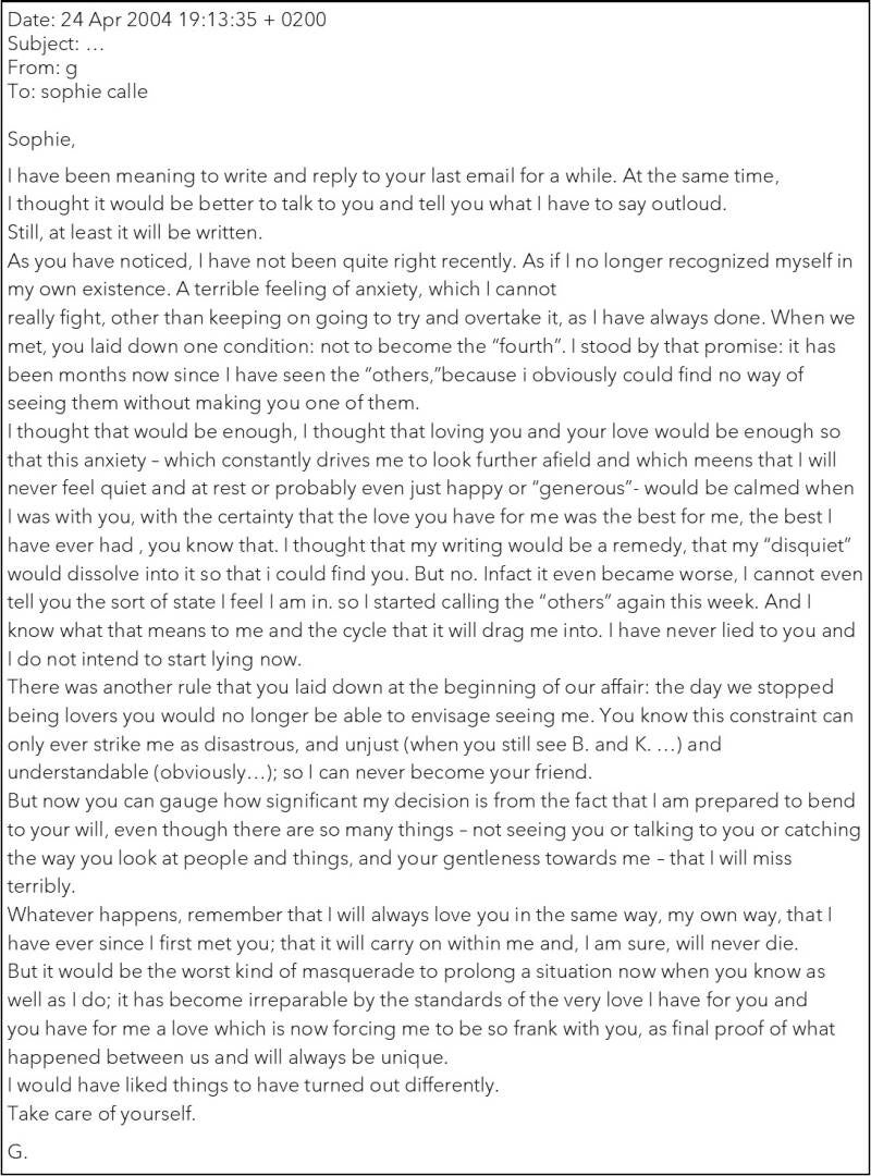 In deze mail van haar toenmalige vriend verbreekt hij de relatie. Sophie vraagt 104 vrouwen, 2 poppen en een kaketoe om vanuit hun achtergrond het bericht te duiden. Het levert zeer uiteenlopende en bijzondere reacties op.