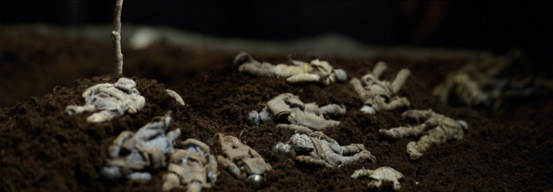 Bovenop de berg lijken beweegt een morbide oorlogsvaandel in de wind: een kaal boompje met het lichaam van een soldaat eraan gespiesd. In een paar tijdsprongen zien we hoe regen en sneeuw op de lijken neerdaalt, en hoe de mensenberg bedekt raakt met een laag modder.