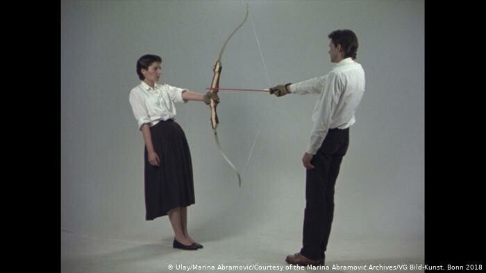 Alsof dát gewoon is. Het idee was om naar ons midden te fietsen. Ik vond het wel een mooi beeld. Het deed me denken aan Ulay en Marina Abramovic. Dit kunstenaarsduo deed samen performances, waarbij het doorstaan van langdurige lichamelijke pijn centraal stond. Zoals in Light / Dark waarin ze elkaar steeds harder in het gezicht slaan. Of Breathing In / Breathing out waarin ze negentien minuten op hun knieën tegenover elkaar zitten, met hun monden op elkaar, in en uit te ademen, terwijl hun neusgaten zitten dichtgestopt met sigarettenfilters. In Relation in Time zitten ze zeventien uur met de ruggen tegen elkaar, met hun haren verstrengeld. Of in Relation Works, waarin ze tegenover elkaar staan, lichtjes naar achteren hellend. Zij houdt de boog vast, hij spant de boog. De pijl is recht op haar hart gericht.