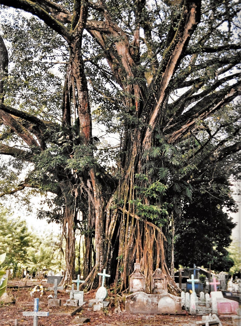 De boom op de foto rechts is al eens decor geweest in griezelfilms, het zou er spoken.