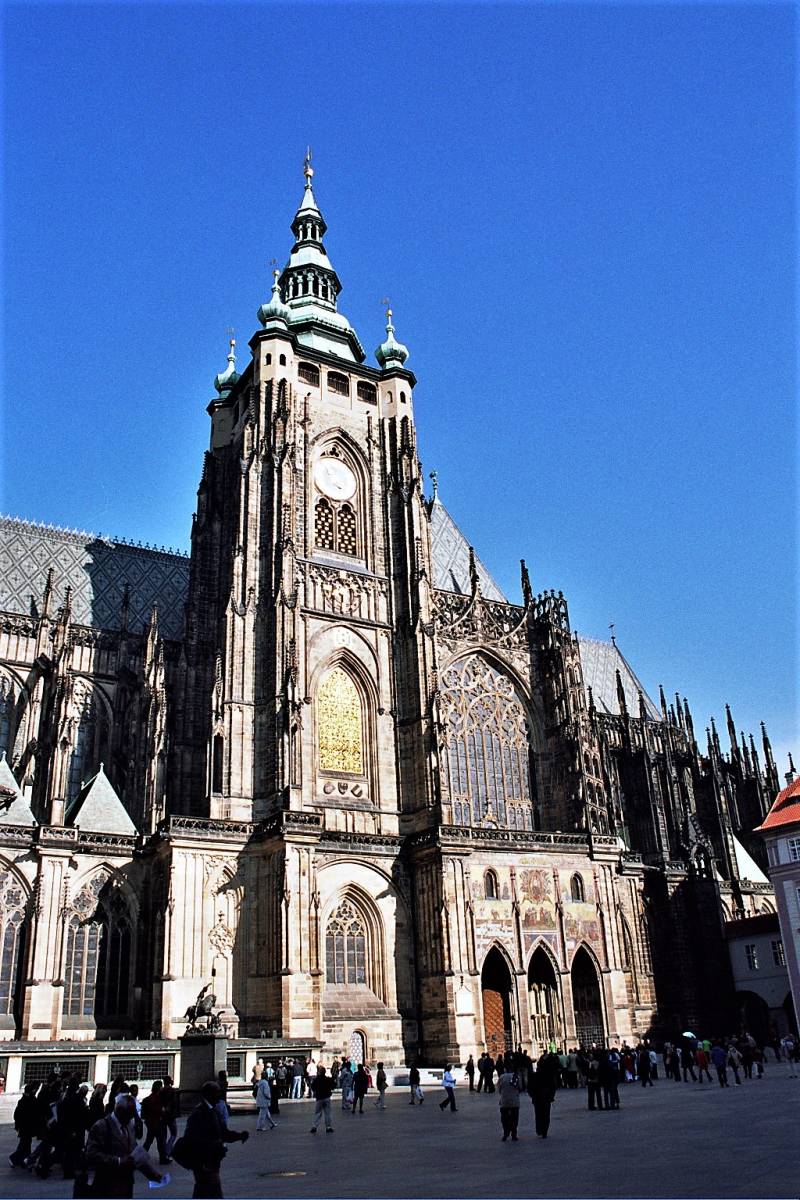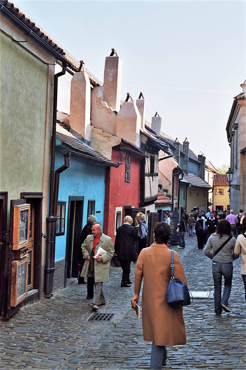Foto links: St. Vituskathedraal. Foto midden: Gouden Straatje. De naam van het straatje duikt voor het eerst op in de 16e eeuw. De elf huisjes werden gebouwd als onderkomen voor de kasteelwachten. Later werd het straatje ook door andere kasteelbedienden bewoond. Een verklaring van de naam is dat onder die bedienden goudsmeden waren. Tussen 1916 en 1917 werd huis nummer 22 bewoond door de bekende Duitstalige schrijver Franz Kafka.