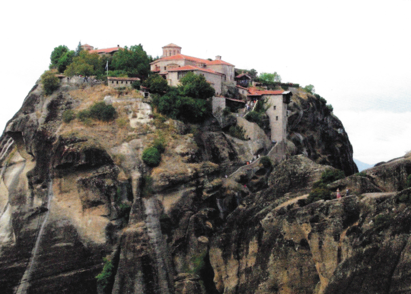 Kalambaka is een dorp tussen Thessaloniki en Athene en beroemd vanwege Meteora. Jaren geleden las ik hierover in de Volkskrant en sindsdien staat het op mijn lijstje. Meteora zijn de op hoge rotspilaren gebouwde kloosters. Door eeuwenlange wind- en watererosie hebben de rotsformaties hun kenmerkende en moeilijk bedwingbare uiterlijk gekregen. Vanaf de 9e eeuw werden de natuurlijke zandstenen torens beklommen door kluizenaars die daar hun eigen leefgebied creëerden en slechts af en toe naar beneden kwamen. Vanaf de 11e eeuw trokken elders verdreven monniken naar dit gebied. Halverwege de 14e eeuw verrezen de eerste kloosters op de toppen. Met netten aan touwen en houten ladders van soms wel veertig meter lang transporteerden de monniken de benodigde goederen én mensen naar boven. In de hoogtijdagen bestond er een autonome gemeenschap van monniken en vierentwintig kloosters in vrijwel volledige afzondering van de rest van de wereld. In de 17e eeuw begon echter het verval van het kloosterleven in Meteora. Er werd gesjoemeld, sommige monniken hielden er als monnik verklede vrouwen op na en van het idealistische gedachtegoed was niets meer overgebleven. In de 18e eeuw werden de kloosters gebruikt als toevluchtsoord voor Grieken die door de Turkse overheersers opgelegde belastingen wilden ontduiken. Tijdens de 19e eeuw werden de Meteora-kloosters gebruikt om te ontkomen aan oprukkende rebellen en tijdens de Tweede Wereldoorlog en de daarop volgende burgeroorlog hebben de toen nog overgebleven kloosters veel schade opgelopen.