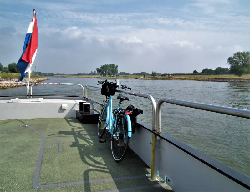 In Wilp neem ik het pontje naar Gorssel. De vriendelijke veerman vindt dat mijn fiets een mooie kleur heeft.