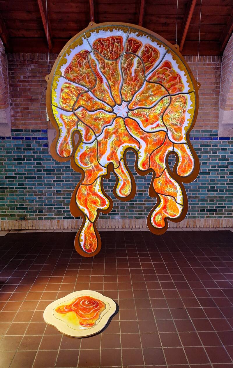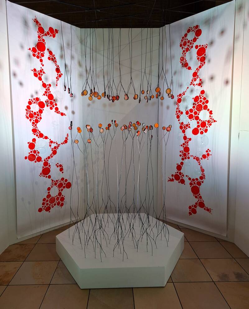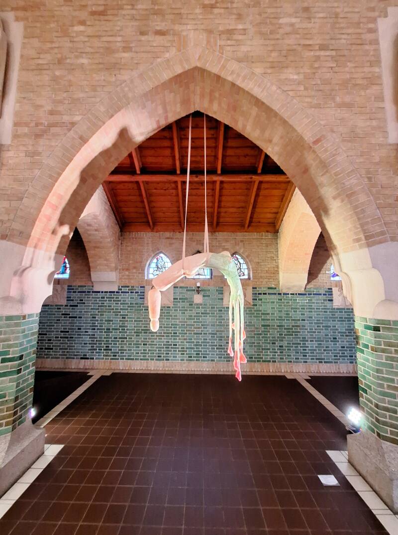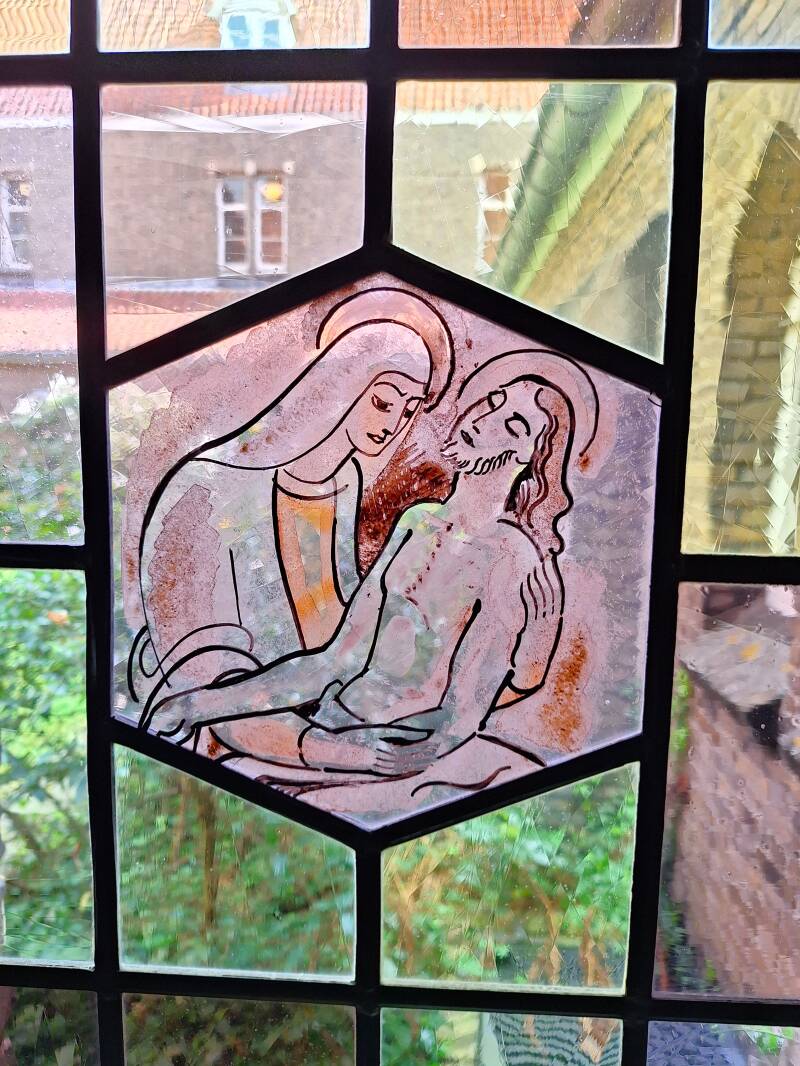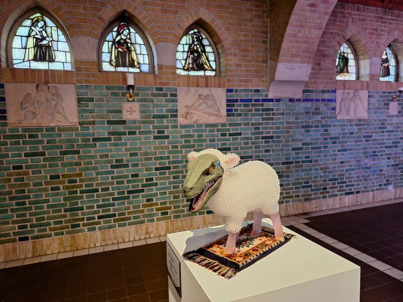 De glas-in-loodramen van het klooster en de reflectie van de bomen op de binnentuin op de muren in de gang sluiten goed aan bij de expositie, een goed gekozen locatie.