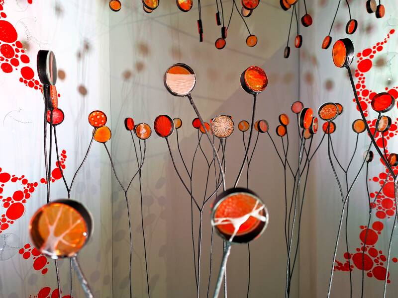 Emmy van de Grift maakt kleurrijke werken van glas in lood, geïnspireerd door verschillende structuren en processen in de natuur. De manier waarop licht door het glas schijnt, verandert door de dag heen en creëert een spel van kleur, licht en schaduw. Dit beïnvloedt niet alleen het werk, maar ook de sfeer van de hele ruimte. Van de Grift maakt kunst vanuit een drang om de kleine schoonheden aan de randen van ons blikveld uit te lichten. Met de glaskunst worden momenten vastgelegd waar de scheidingslijn tussen mens en natuur even niet meer te voelen is.