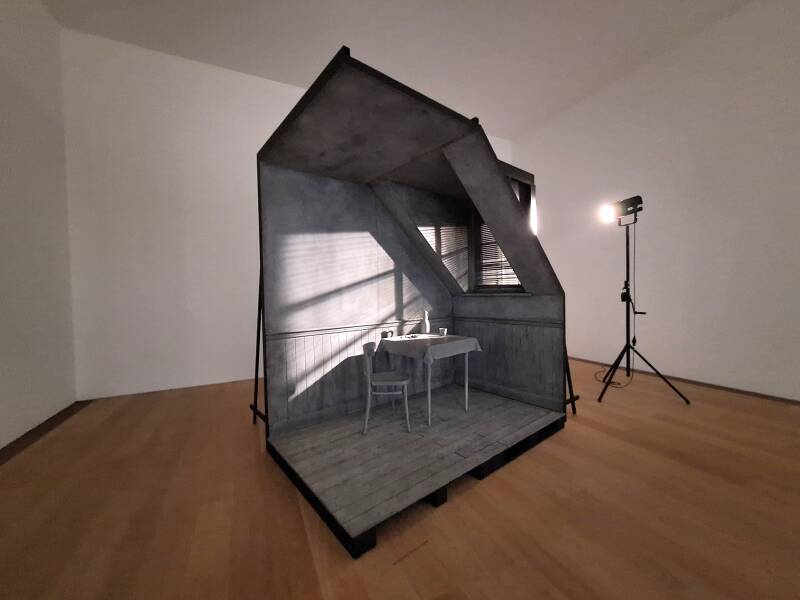 Welke dingen laten we achter als we zelf verdwijnen? We zien een deel van een zolderkamer, een sc1ene waaruit bijna alle kleur is weggeëbd. Hans Op de Beeck maakte alles grijs. Vrijwel alles lijkt daardoor bedekt met een laag as. Door het dakraam valt licht op de tafel met daarop een schoteltje met bramen, het enige van kleur in de ruimte. De monochrome ruimte voelt leeg en verlaten, maar de aanwezigheid van dit vers ogende fruit lijkt te suggereren dat iemand hier nog recent was. In zijn werk isoleert Op de Beeck vaker banale zaken uit het dagelijks leven, waardoor het gewone buitengewoon wordt. Eerder zag ik in mijn woonplaats een tentoonstelling van hem met soortgelijke werken.