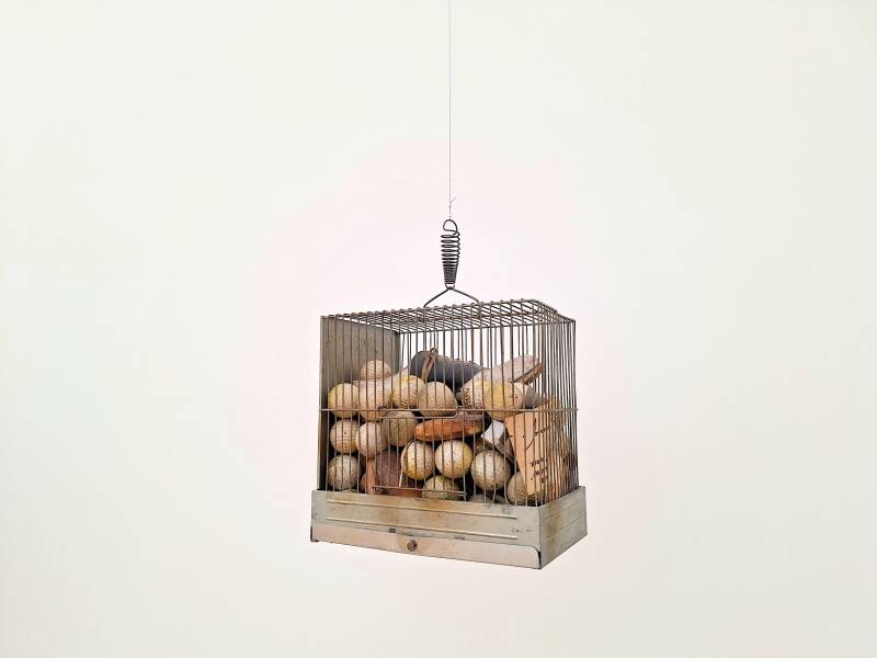 Claes Oldenburg is beroemd om zijn kolossale kunstwerken in de openbare ruimte, zoals een gigantische schaar of tube tandpasta. Dit soort alledaagse voorwerpen bezitten volgens de Zweedse popartkunstenaar een bepaalde magie, die we, door onze focus op het gebruik, vaak over het hoofd zien. Door dingen op een andere manier te presenteren, wil hij uitsagen om eens écht te kijken naar wat ons dagelijks omringt. In dit kooitje stopte hij onder andere schoenen, zeep en golfballen. "Als je een gewoon object een ander gewoon object laat ontmoeten", zei Oldenburg, "dan krijg je iets buitengewoons."