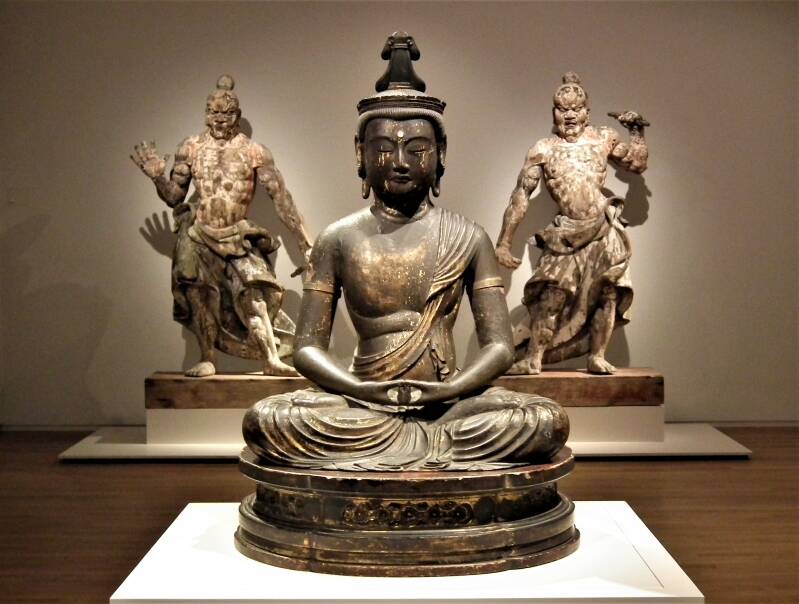 Foto links: Shotoku Taishi. Deze staatsman was rond 600 een belangrijke voorvechter van het boeddhisme. Later werd hij zelf als godheid vereerd. Hier is hij afgebeeld als kind van twee, toen hij volgens de overlevering voor het eerst Boeddha aanbad.