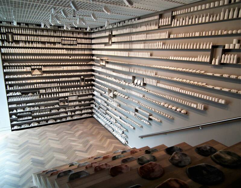 Het is een sympathiek gebouw, licht, niet te groot maar wel ruim ogend, overzichtelijk. Qua sfeer lijkt het op museum Voorlinden, in Wassenaar. Er is wat voor te zeggen, om geen bordjes op te hangen. Zodat je eerst zelf bedenkt wat een kunstwerk met je doet, wat het voor jou betekent. Maar om vervolgens de hele tijd die info op je mobiel te moeten lezen is ook niet fijn. Zeker als je eerst steeds die kunstwerken op de pagina moet zien te vinden en door veel (nutteloze) info moet scrollen. Na vragen blijkt dat je op je mobiel een account kan aanmaken, en dan kun je het kunstwerk naar keuze liken en de informatie thuis rustig teruglezen. Maar dat moet je per kunstwerk doen, je kunt niet alles tegelijk selecteren. Wat nog minder fijn is, is dat publieksmedewerkers zich geroepen voelen het gat op te vullen wat de afwezigheid van de bordjes zou kunnen veroorzaken. Ze komen op je af, vertellen wat je ziet, of mist als je niet goed genoeg kijkt. Daarmee schieten ze hun doel van zelf kijken en ervaren voorbij. Je ziet daardoor misschien meer dan je anders zou doen, maar bij mij wekt het ergernis op.