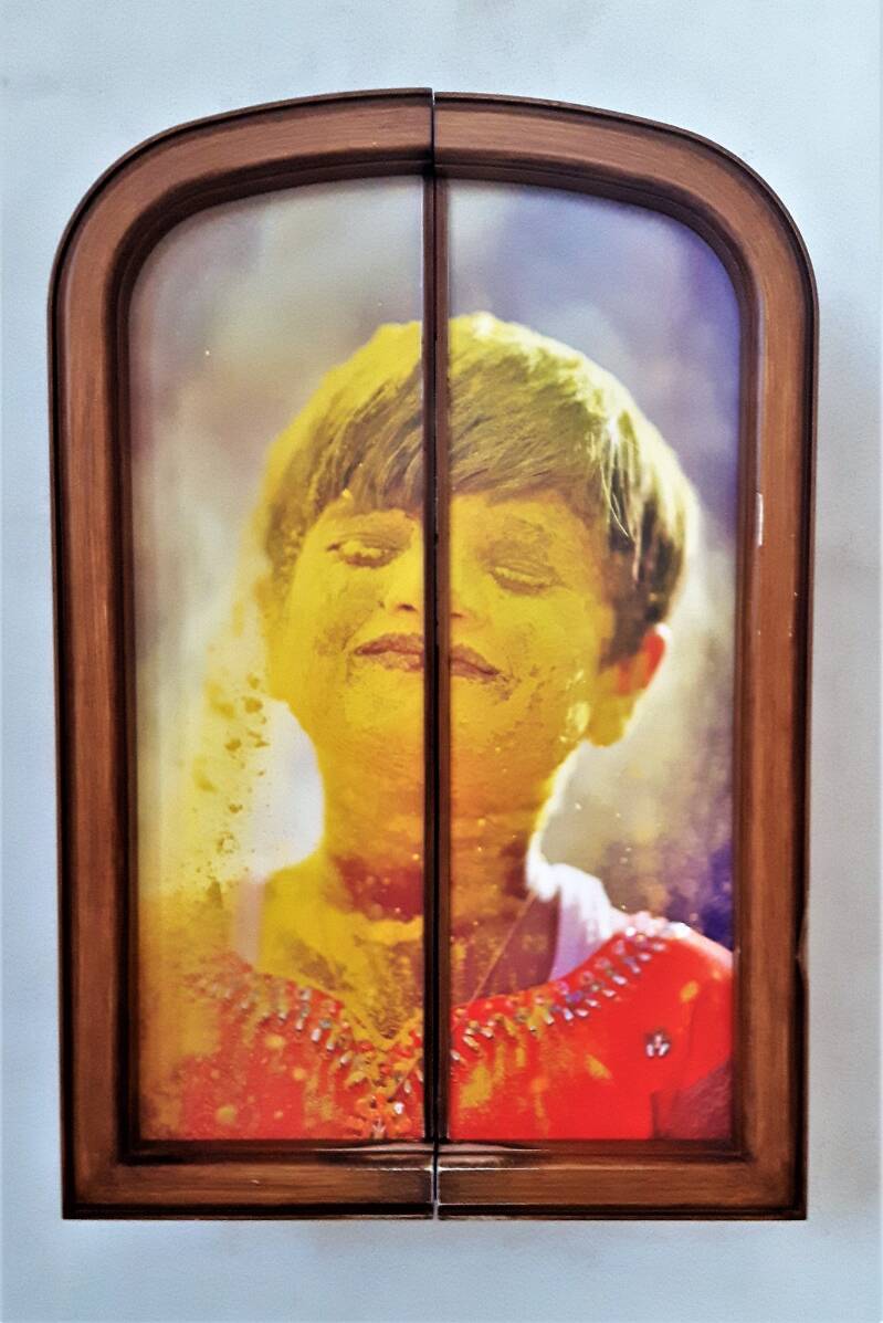 Verderop in de kerk aandacht voor multiculturele feesten. Erg leuk gedaan. Er hangen houten luiken. Op de buitenkant van die luiken zijn foto's bevestigd van diverse feesten uit diverse culturen. Als je de luiken opent zie je voorwerpen die dat feest symboliseren.