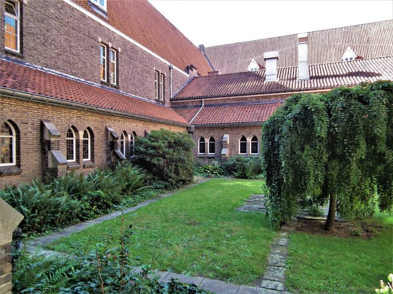 Iets verderop staat het grote kloostercomplex Onze Lieve Vrouw ter Eem, gebouwd rond 1932 voor de zusters van Onze Lieve Vrouw van Amersfoort. Het complex omvatte een klooster voor de zusters, een kapel en twee meisjesscholen met internaten met plaats voor tweehonderd meisjes. In 1981 werd het internaat gesloten en werden delen van het klooster verhuurd. In 2008 vertrokken de laatste zusters. Het Eemklooster huisvest nu erfgoedinstellingen. Als ik aankom blijken ook hier rondleidingen te zijn, maar ik kan over 10 minuten al aansluiten. We worden rondgeleid door twee tijdelijke bewoners die op het pand passen.