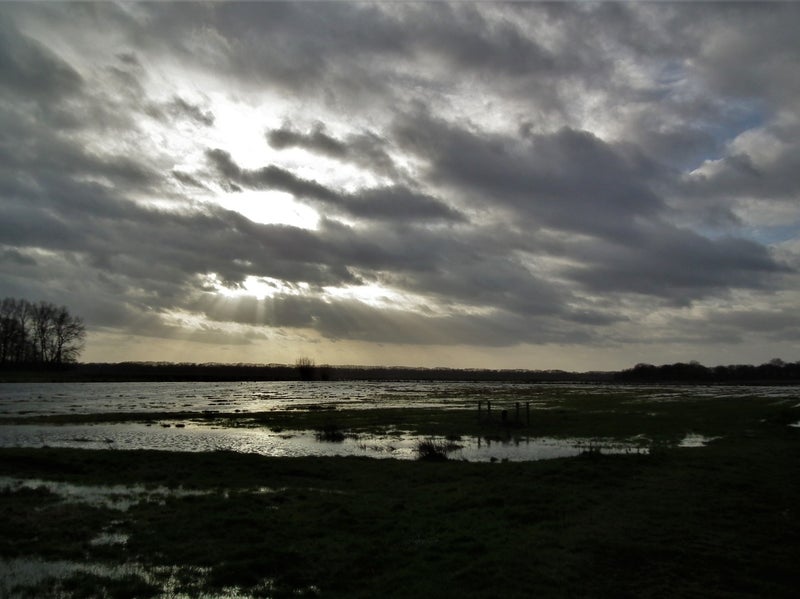 Aan de overkant van het parkeerterrein, gevalletje tegenlicht, drassig land en Hollandse luchten.
