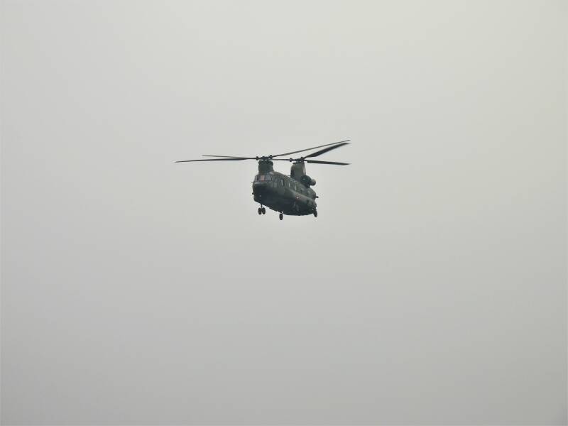 Maar dan ben ik er eindelijk, bij Treekerpunt, waar ik vorige week was. De oefenende militairen op de Leusderhei zorgen met hun geweren voor achtergrondmuziek. Als er ook nog twee Chinooks laag komen overvliegen is de film compleet. Het geluid van de klapperende bladen is zo indringend dat ik de neiging krijg om weg te rennen.
