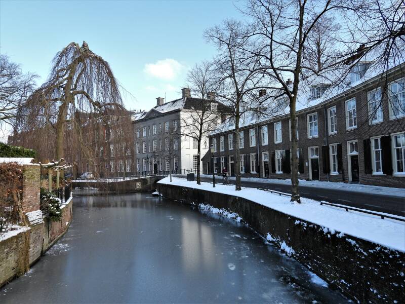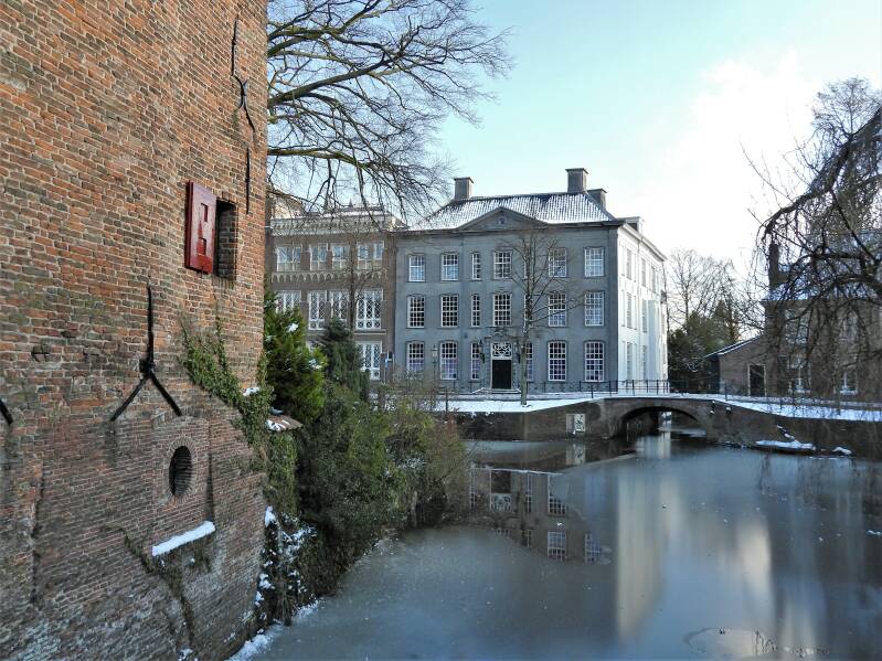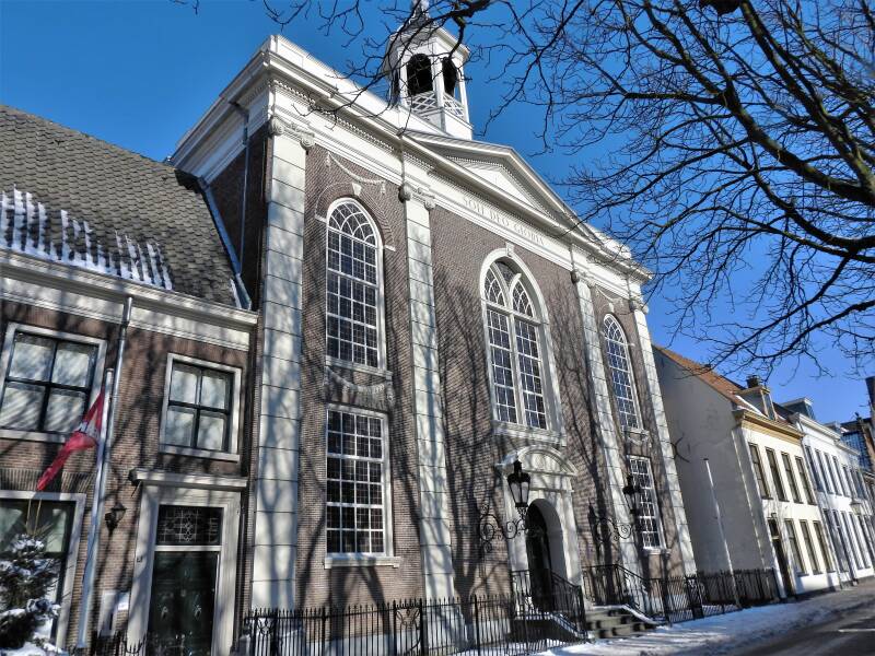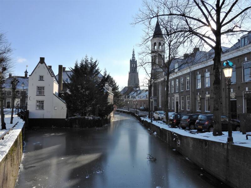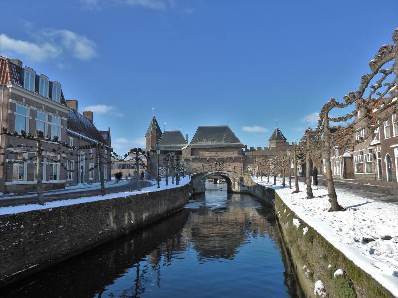 Op de foto midden de Bollenburg, het ouderlijk huis van Johan van Oldenbarnevelt. Het gebouw dateert uit ca. 1400 en is één van de oudste en gaafste muurhuizen van de stad. In 2019 kreeg ik er een rondleiding op Open Monumentendag. Op de foto rechts de synagoge, de 'Sjoel', een gebouw uit 1726. Op de rechterbovenfoto hieronder Het Huis met de Paarse Ruiten. De kleur van de ruiten wordt veroorzaakt door het mangaan in het glas dat paars verkleurt onder invloed van het licht. In dit huis logeerden stadhouder Willen V en zijn vrouw in 1787. Ook hier was ik eens met een rondleiding op Open Monumentendag.