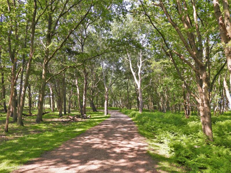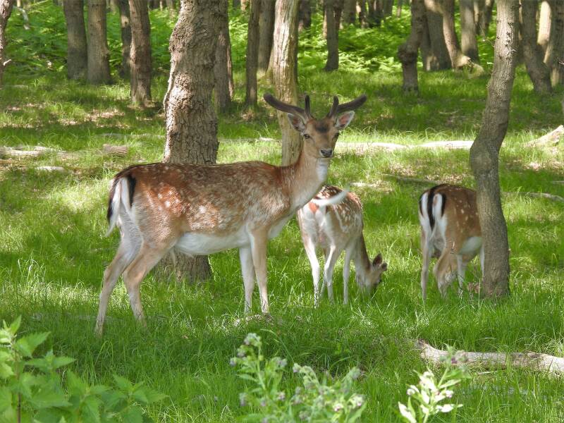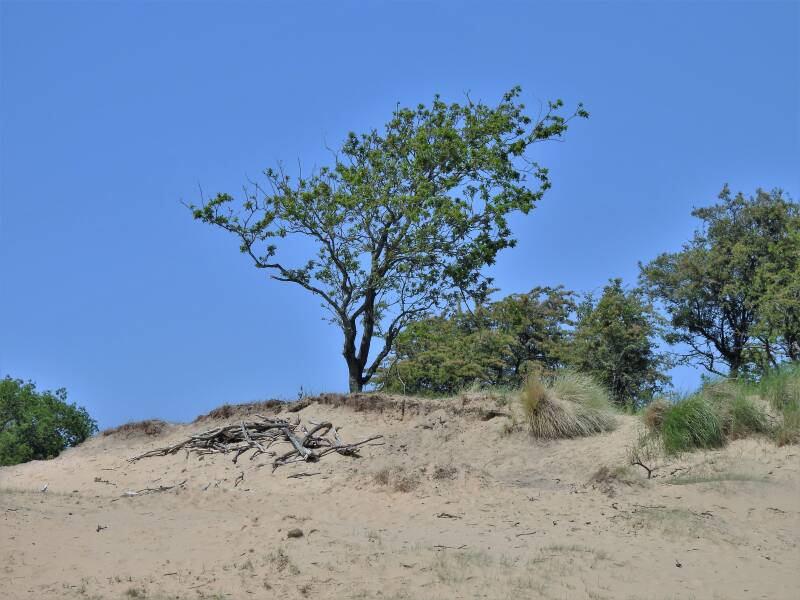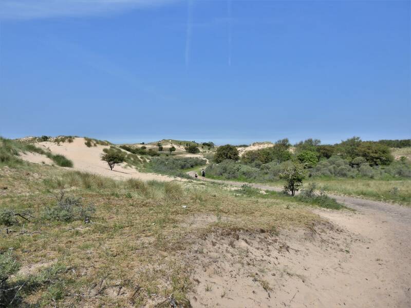 Het landschap is zo veelzijdig. Ik waan me af en toe in een ander werelddeel. Weidse uitzichten, knusse bospaadjes, zandpaden door de duinen, het is allemaal even mooi. En heerlijk rustig. Op een gegeven moment kom ik langs een veld waarin ik een kievit zie. Net te ver om goed op de foto te krijgen. Maar dan vliegt hij opeens schuin boven me. Hij produceert een geluid alsof je in een rubberen eendje knijpt. Ik ben even bang dat hij me aanvalt, zo blijft hij boven me hangen. De eerste keer vergeet ik uit schrik mijn camera te pakken. De tweede keer kan ik het knopje om te filmen niet snel genoeg vinden. Waarschijnlijk zaten er jongen dichtbij die verdedigd moesten worden.