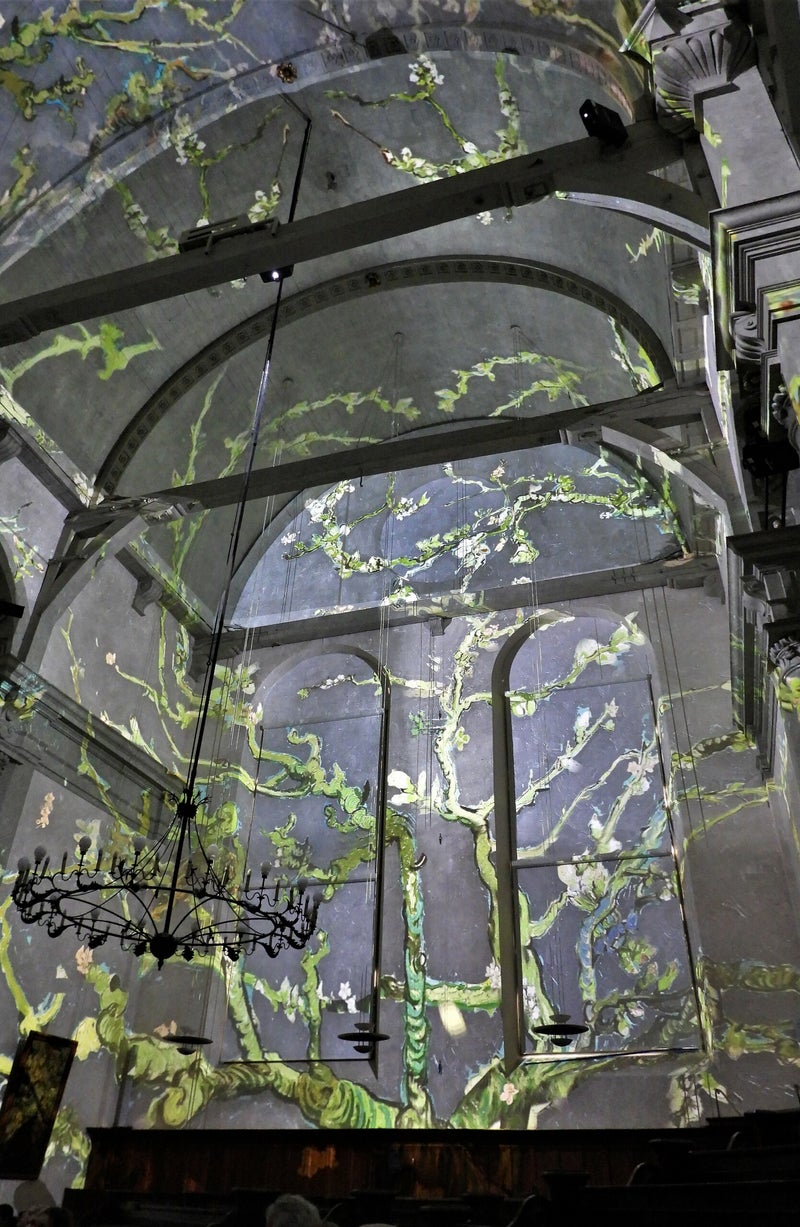 De hele kerk wordt ondergedompeld in zonnebloemen of bloesemstruiken. Alles beweegt, stroomt, dwarrelt en suist over wanden en gewelven.