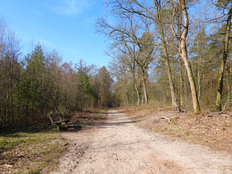 Opeens is er een stukje spannend bos. De stammen dichter op elkaar, het is er donker. Takken kraken doordat ze langs elkaar schuren. Ik moet denken aan de film De Noorderlingen van Alex van Warmerdam. Daar komt de postbode ook regelmatig uit een dergelijk bos fietsen. In dat stukje bos staat een bankje. Heel theatraal.