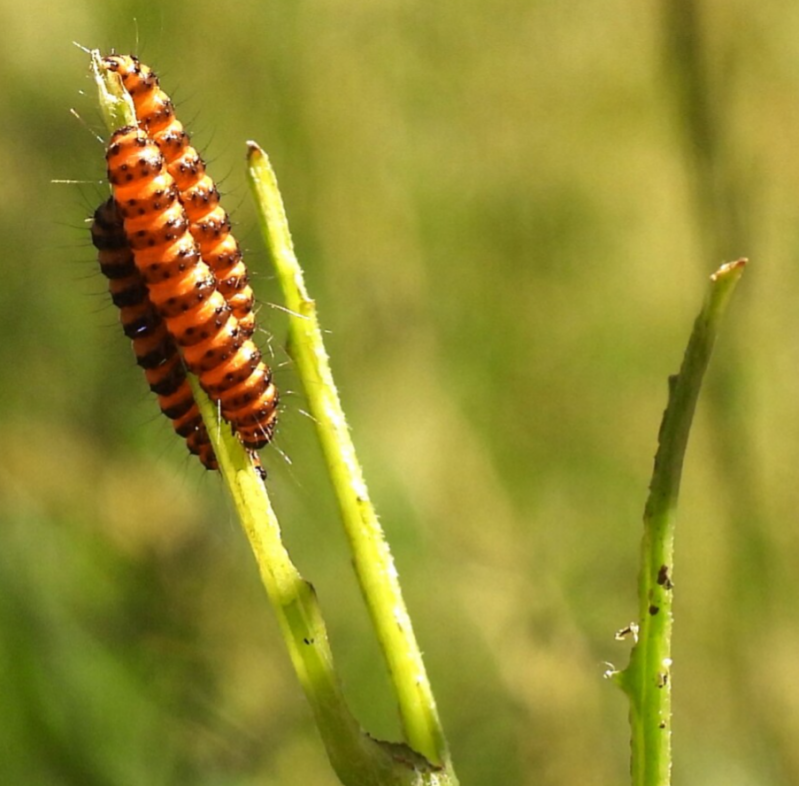 Rups van de Sint-Jacobsvlinder op het giftige Jacobskruiskruid. Zolang de plant groeit en bloeit is er weinig risico, het kruid smaakt bitter en wordt normaal gesproken niet gegeten door paarden, koeien en schapen. Na het maaien verliest de plant haar typerende geur, kleur en smaak, maar het gif blijft werken. Het gif wordt bij regelmatig eten in de darmen opgenomen. Daarna probeert het lichaam de gifstoffen in lever om te zetten in minder giftige stoffen. Dit proces levert echter een nog giftigere stof op. Dat maakt de levercellen kapot.